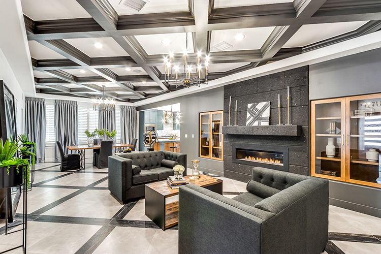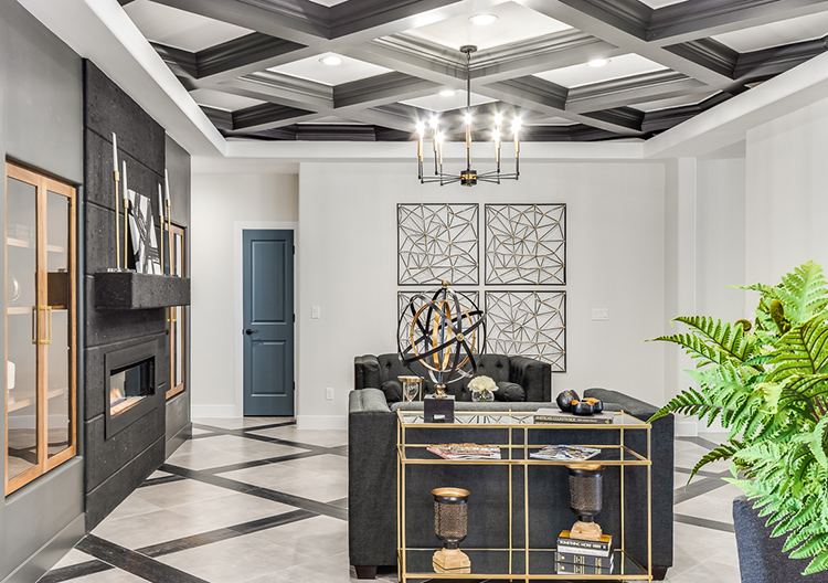 The Athena House by Pointe Homes features dramatic architectural details, striking coffered ceilings, and open gathering spaces designed to bring people together. With a statement kitchen, elegant living areas, a private theater room, and refined finishes throughout, the home blends modern design with comfortable everyday living.